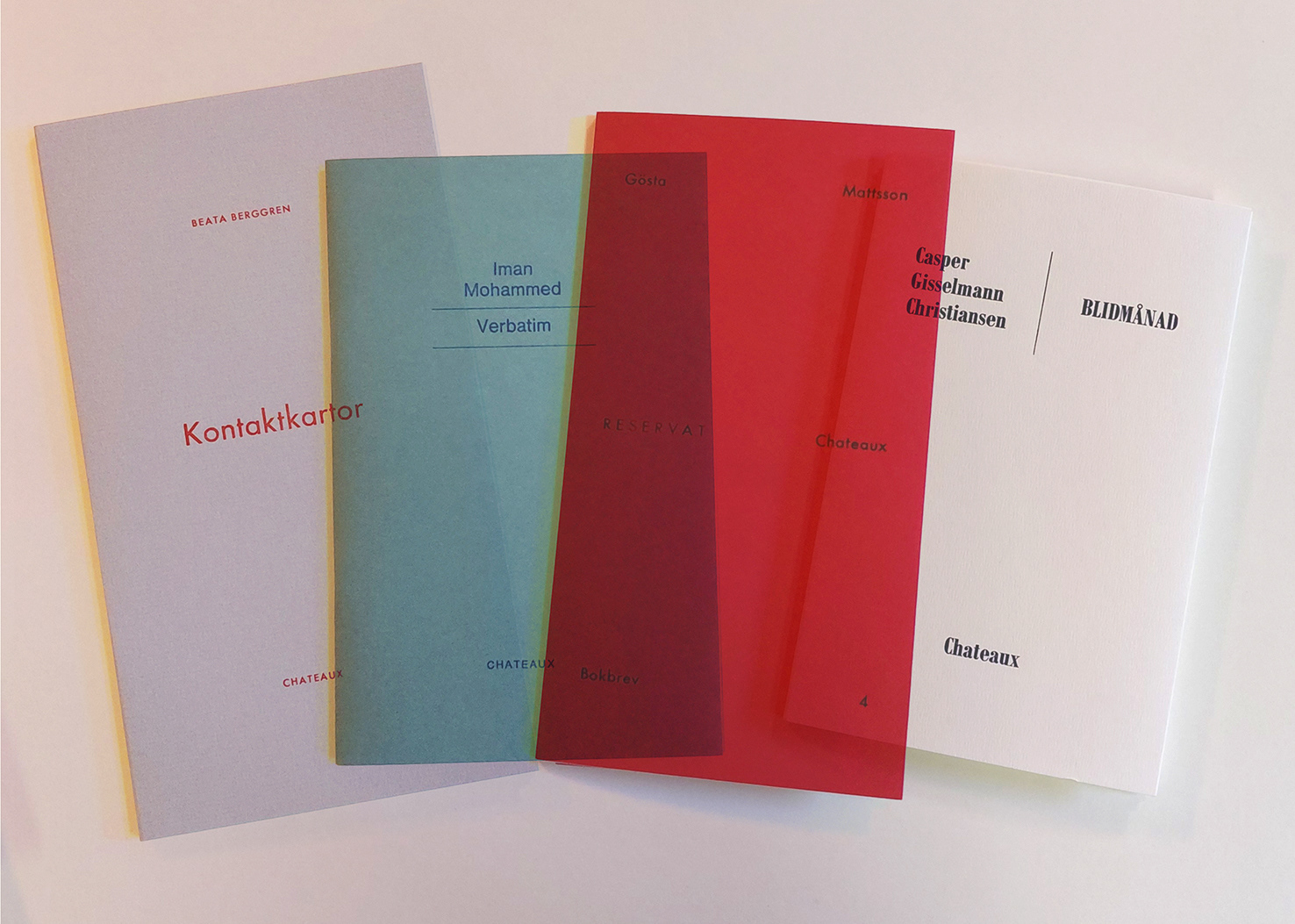 Chateaux är i färd med att ge ut två nya poesiböcker. I januari kommer den fjärde titeln i serien Bokbrev: Reservat av Gösta Mattsson. Och i februari kommer Blidmånad av den danske poeten Casper Gisselmann Christiansen, i översättning av Beata Berggren.
